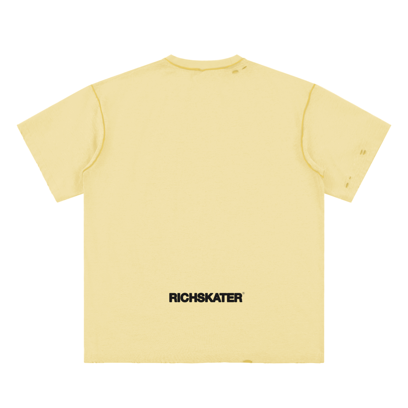 Yellow cotton short-sleeve T-shirt featuring a warped star graphic printed at the chest and Richskater logo at the back hem. Distressed details throughout add a vintage, lived-in look. Loose drop-shoulder cut with an oversized streetwear feel.